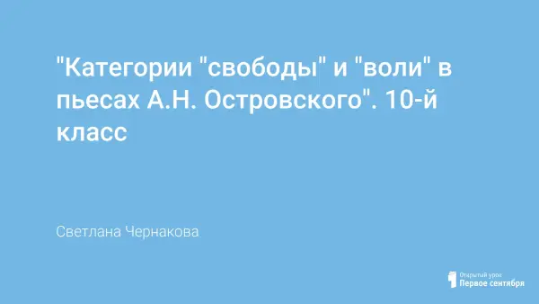 Цель урока: выявить сходство и различие категорий "свобода" и "воля" на семантическом, этимологическом, ассоциативном уровне; определить роль категорий в пьесах А.Н. Островского "Гроза" и "Бесприданница". Урок развивает читательский кругозор, мышление, коммуникативные умения учащихся, приобщаети к духовным ценностям в знакомстве с литературными произведениями.