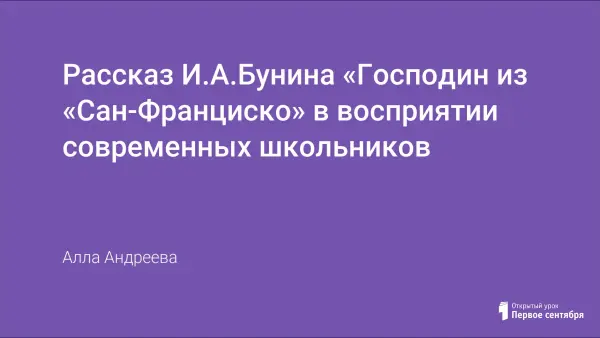 В статье описано, как воспринимают современные школьники шедевр И.А.Бунина, какие проблемы волнуют их особенно остро. Учитель демонстрирует, как сделать беседу с учениками композиционно стройной, направить разговор в нужном направлении, какие вопросы предложить для осмысления, какие акценты расставить. На уроке ученики познакомились с историей создания рассказа «Господин из Сан-Франциско», вспомнили сюжет, ответили на вопросы.