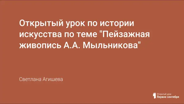 Содержанием урока является пейзажная живопись известного советского художника Андрея Андреевича Мыльникова. Из многих аспектов его многостороннего искусства преимущественное внимание уделено именно пейзажному искусству – как жанру, не подвергавшемуся выборному анализу и оценке. Доказательным аргументом выступают произведения, подаренные мастером родному городу – краеведческому музею г. Энгельса (Покровска) Саратовской области.