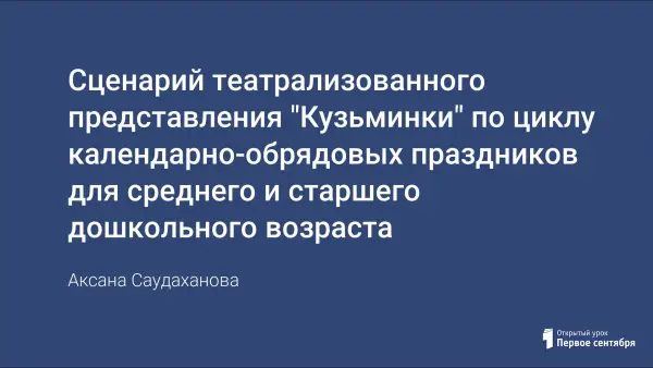 Представлено театрализованное представление «Кузьминки» по циклу календарно-обрядовых осенних праздников для среднего и старшего дошкольного возраста в рамках театрально-этнографического кружка.