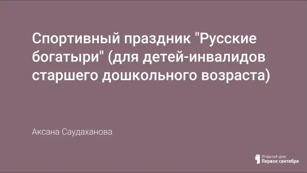 Цель праздника: формировать представление о героическом прошлом русского народа; воспитывать чувство гордости за богатырскую силу России, уважение к русским воинам, желание им подражать; развивать двигательные навыки детей; создать положительный эмоциональный настрой, веселое, бодрое настроение.