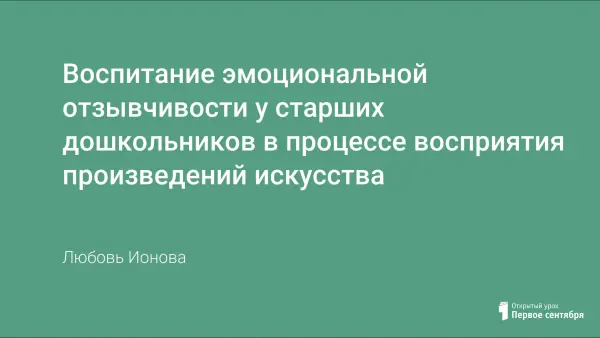 В статье обобщен опыт коллектива СП «Детский сад Журавушка» ГБОУ СОШ №1 г.Похвистнево по воспитанию эмоциональной отзывчивости у старших дошкольников в процессе восприятия произведений искусства посредством применения различных форм, методов и технологий, таких как проектная деятельность, детская Ассамблея искусств, технология «Образовательное путешествие», мультстудия и другие.