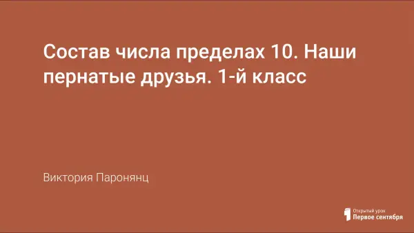 Цель урока: создать условия для закрепления знаний учащихся по теме «Состав чисел в пределах 10». Задачи: называть и обозначать действия сложения и вычитания; понимать отношения между числами (больше, меньше, равно); учащиеся учатся любить и понимать природу.