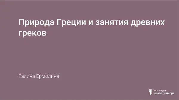 Урок соответствует ФГОС, проводится в 5-м классе. В ходе урока учащиеся знакомятся с географическими и природными условиями Древней Греции, населением и его основными занятиями. Развиваются умения учащихся работать с исторической картой, текстом учебника и иллюстрациями.