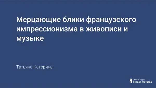 Цель работы - раскрыть понятие импрессионизма, его стилистических особенностей в таких видах искусства, как живопись и музыка. В работе даётся трактовка определения импрессионизма в искусстве, рассмотрены социально-исторические причины возникновения данного направления, выявлены стилистические черты импрессионизма в живописи, проанализированы отдельные произведения музыкального и живописного искусства. Данную работу можно использовать на уроках музыки, МХК, изобразительного искусства в 7-9 классах, а также во внеклассной работе (мероприятия культурологической направленности).