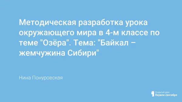 Цель урока: расширить кругозор учащихся об озере Байкал: познакомить с его размерами и красотой, удивительным животным миром и значением озера для людей; прививать любовь к бережному отношению и охране уникальной жемчужины.