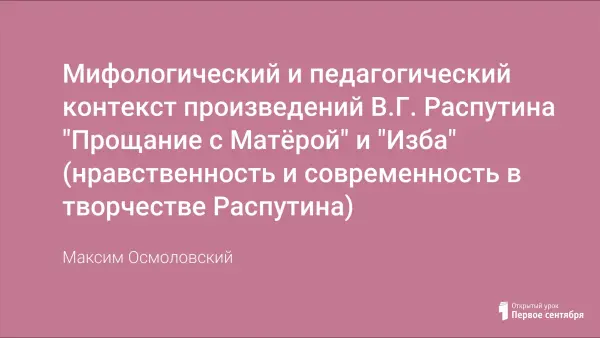 Статья содержит материалы к урокам по произведениям Валентина Распутина, написанным в разные годы и изучаемым в выпускном классе средней школы. В статье прослеживается связь творчества писателя с традициями русского фольклора, классической и современной русской литературы на уровне проблематики и образной системы, отмечается тяготение писателя к мифопоэтическим образам и стремление вложить в идею своих произведений глубокий педагогический смысл. Осмысление проблем современности с позиций мифологической традиции - такова подоплёка и повести "Прощание с Матёрой", написанной в 70-е гг., и рассказа "Изба", созданного в 90-е.