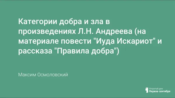 Леонид Андреев - один из немногих в русской литературе писателей, посвятивших своё творчество поиску парадоксальных ответов на сложнейшие этико-философские вопросы. Диалектика добра и зла, преданности и предательства особенно ярко представлена в творчестве Леонида Андреева произведениями "Правила добра" и "Иуда Искариот". В статье даётся анализ названных произведений Л.Н.Андреева в контексте эволюции понятий добра и зла в литературе и философии XX века, развития темы добра и зла в творчестве писателя, стиля и художественных особенностей произведений. Уделяется внимание философскому и литературному интертексту в произведениях Андреева.