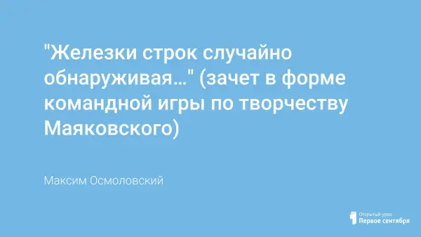 Игровая методика – один из принципов разработанной М.В. Осмоловским модели современного урока литературы в школе. Предлагаемый вариант проведения зачёта в форме командной игры по творчеству В.В. Маяковского – это урок словесности, наглядно демонстрирующий возможности и эффективность использования игровой методики на уроках обобщающего повторения и контроля знаний.