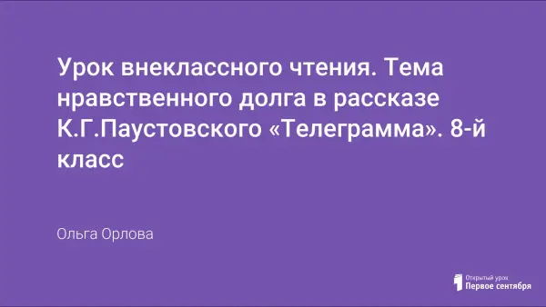 Рассказ К.Паустовского затрагивает важнейшую нравственную проблему: отношения детей и родителей. Как часто и быстро дети спешат на помощь к родителям, живущим далеко, как часто пишут письма и звонят, как проявляют заботу о них, всегда ли заботливы к старикам и нежны ли и ласковы с ними? Рассказ «Телеграмма» - грустная история о матери. Читателю дается урок бережного и благодарного отношения к своим родителям. Целями урока: познакомить учащихся с историей создания рассказа и его композицией, проследить за авторской позицией, определить понятие «нравственный долг»; развивать мышление и речь учащихся; воспитывать уважение к родителям, любовь к малой родине.