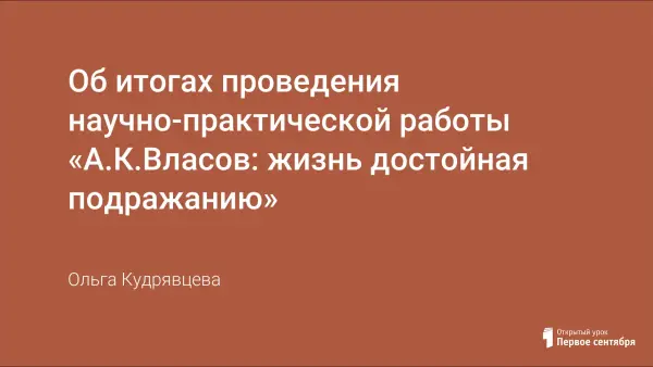 Данная работа посвящена итогам проведённой научно-исследовательской работы в рамках конференции школьников посвященная Алексею Константиновичу Власову. Кроме исследовательского вопроса, она затронула и вопрос патриотического воспитания школьников. А.К.Власов – уроженец Владимирской губернии, наш выдающийся земляк. Для подростка очень важен пример для подражания. Таким примером служит наш соотечественник Алексей Константинович. Его творческая биография способна вызвать отклик и переживания у школьников.