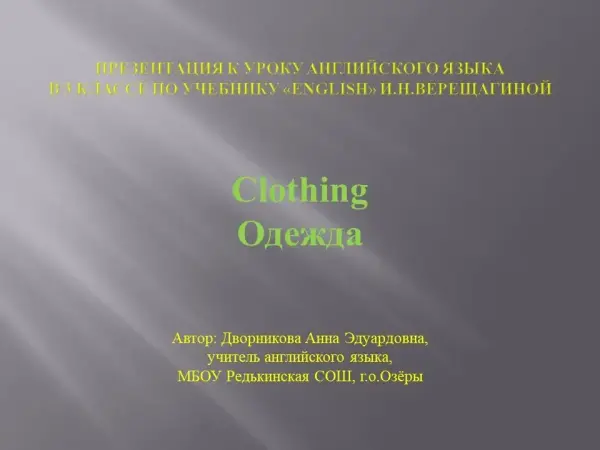 Цель урока: формировать навыки употребления лексических единиц по теме «Одежда» в монологической и диалогической речи; выработка знаний, умений и навыков в области чтения, аудирования, устной и письменной речи по теме.