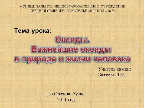 Урок изучения нового материала направлен на формирование у учащихся понятия бинарных соединений на примере оксидов. Он расширяет представления учащихся о важнейших оксидах, их свойствах и роли в природе и жизни человека. Использование фотозагадок позволяет повысить познавательный интерес к предмету.