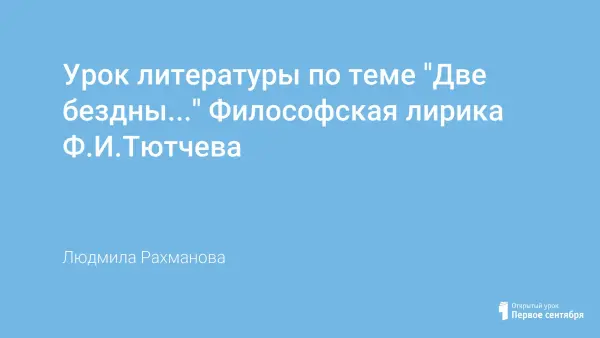 Урок литературы по теме "Две бездны..." Философская лирика Ф.И.Тютчева" представляет собой урок, направленный на обобщение изученного материала, систематизацию полученных знаний, способствует восприятию материала по теме урока, развитию познавательных интересов по изучению философской лирики поэта. Урок нацелен также на развитие речевых навыков учащихся, направлен на решение проблемных задач нравственного характера, формирует навыки работы с текстами стихотворных произведений поэта.