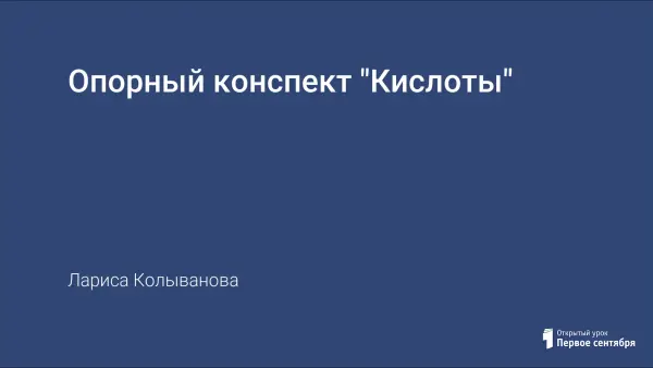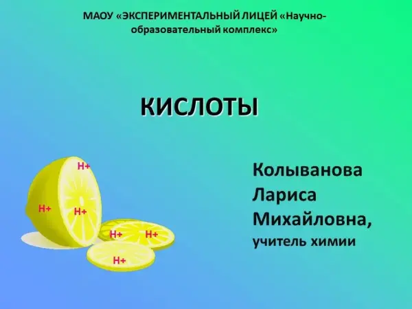 Кислоты — сложные вещества, состоящие из атома водорода, способного замещаться на атомы Ме, и кислотного остатка. Кислоты - это электролиты, которые при диссоциации поставляют в водный раствор катионы водорода и никаких других положительных ионов не образуют/