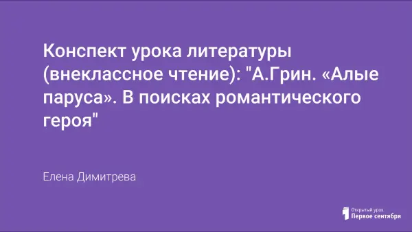 Основная идея урока - познакомить учащихся с романтическими героями феерии А.Грина "Алые паруса"; закрепить знания учащихся по теме "Романтизм" (основные черты романтического героя, основные приёмы композиции и тропы романтического произведения). Основным методом урока "В поисках... романтического героя" является дискуссия, что позволяет развивать у учащихся способность анализировать сложные ситуации, выявлять причины их возникновения, различать главное и второстепенное, а также развивать умение учащихся дискутировать, аргументировать свою точку зрения, чётко формулировать и ясно излагать свои мысли.