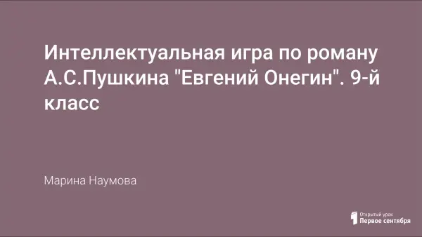 Данная интеллектуальная игра проводится в 9-м классе после изучения романа А.С.Пушкина «Евгений Онегин». Цель занятия - повышение интеллектуального и культурного уровня, расширение кругозора учащихся, а также проверка знаний школьников по роману «Евгений Онегин». Проходить оно будет в форме игры КВН. В ней примут участие две команды, которым предстоит сразиться в 5 конкурсах: «Разминка», «Ситуации», «Перевёртыши», «Шедевры мировой живописи» и «А помните?». Эти задания потребуют хорошего знания содержания произведения. За правильный ответ команда зарабатывает 1 балл. В конце игры подводятся итоги. Побеждает команда, набравшая большее количество баллов.
