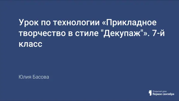 Цели урока: познакомить учащихся с историей возникновения и развития техники “Декупаж”, с основным применением в интерьере; научить простейшим приёмам начального этапа салфеточной техники “Декупаж” через элементы образного мышления.