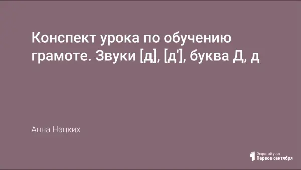 Задачи урока: познакомить детей с новыми буквами, обозначающими согласные звуки [д], [д`], учить детей давать характеристики звукам; способствовать развитию фонематического слуха, речи, расширять кругозор; формировать плавное, выразительное, сознательное чтение.