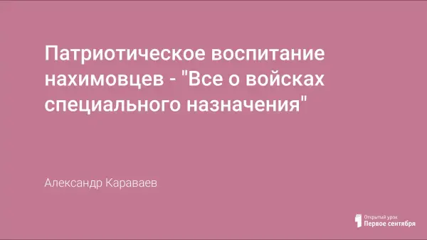 Цель: ознакомление учащихся с интересными и малоизвестными сведениями об истории спецназа России его создании и перспективах развития; воспитание чувства гордости за свое Отечество, патриотизма, понимания необходимости прохождения военной службы, любви к Вооруженным Силам, Военно-Морскому Флоту, ориентация нахимовцев на выбор профессии.