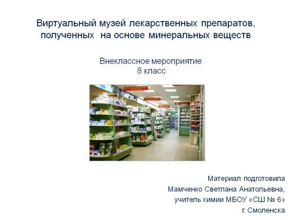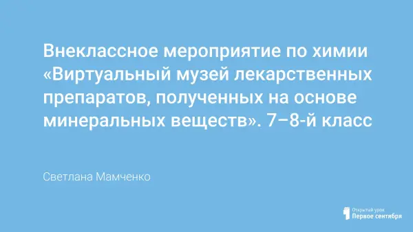 Учащиеся создают виртуальный музей лекарственных препаратов, работают в группах, анализируют различные источники информации; знакомятся с химическим составом и свойствами лекарственных средств, полученных из минеральных веществ, приобретают основы фармакологических знаний и бережного отношения к своему здоровью, развивают творческие и коммуникативные способности.