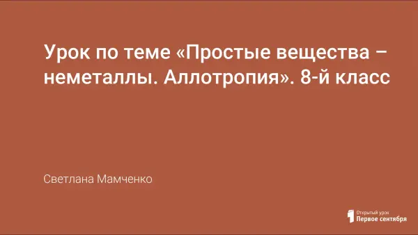 Урок с элементами игры «Расследуют химики». Обучающиеся знакомятся с общими физическими свойствами неметаллов, их ролью в живой и неживой природе, в жизни человека. В ходе урока формируются понятия «аллотропия», «аллотропные видоизменения, или модификации», изучается явление аллотропии на примере аллотропных модификаций кислорода, фосфора, углерода.