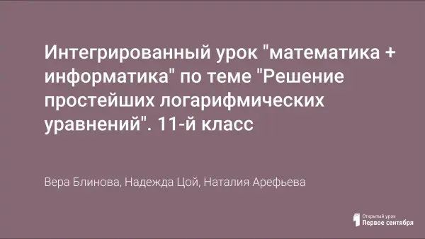 Повторяются основные логарифмические свойства и формулы, алгоритм решения логарифмических уравнений, составляется программа решения логарифмического уравнения. Отрабатываются навыки решения простейших логарифмических уравнений, правильность решения проверяется на компьютере составленной программой. Проводится тестирование.