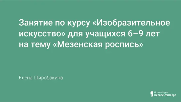 Занятия по курсу «Изобразительное искусство» для учащихся 6–9 лет вводит в мир истории нашей необъятной родины, используя, технику, образы и язык росписи, что воплощается в творческих работах. Представлен план-конспект, учебно-методический комплекс (презентация темы «Мезенская роспись», наглядные таблицы по теме).