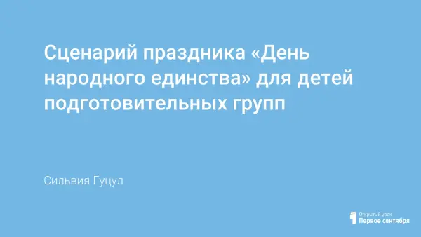 В статье содержится авторская программа сценария «День на родного единства» для детей подготовительной группы. Задачами данного мероприятия являются: формировать у старших дошкольников понимание принадлежности к русскому народу и России как единой Родине всех проживающих на её территории людей; вызывать интерес к историческому прошлому и культурному наследию нашей страны. В программе развлечения содержатся упражнения с музыкальным сопровождением, что способствует художественно-эстетическому развитию ребенка. В процессе участия дети знакомятся с различными видами искусств. Праздник развивает эмоции, поднимает настроение и жизненный тонус. Программа развлечения построена на активном участии ребенка на протяжении всего мероприятия. Длительность праздника составляет 50–60 минут.