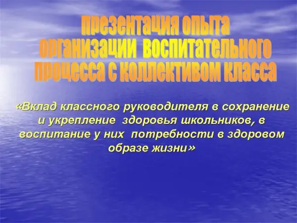 Представлен опыт воспитания класса, который был представлен на конкурс классных руководителей в номинации «Вклад классного руководителя в сохранение и укрепление здоровья школьников, воспитание потребности в здоровом образе жизни».