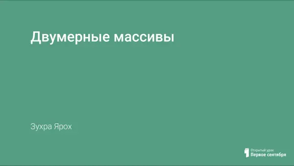 Ярох Зухра Асхатовна Найдено публикаций: 1 04.07.2019 Информатика Двумерные массивы Представлена презентация "Двумерные массивы". Читать дальше