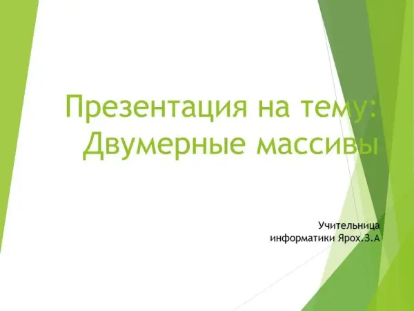 Ярох Зухра Асхатовна Найдено публикаций: 1 04.07.2019 Информатика Двумерные массивы Представлена презентация "Двумерные массивы". Читать дальше Номинант конкурса «Презентация к уроку 2019»