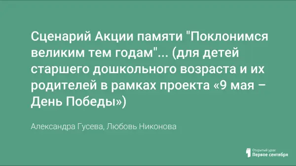 Сценарий Акции памяти "Поклонимся великим тем годам"... (для детей старшего дошкольного возраста и их родителей в рамках проекта «9 мая – День Победы»)