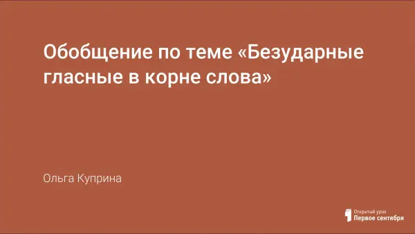 Это заключительный урок в теме «Безударные гласные», поэтому тип урока - урок общеметодологической направленности (УМК "Школа России", 2-й класс). Выделяется особая задача на уроке: формировать умение оценивать свои знания и умения по данной теме. Умение правильно обозначать на письме безударные гласные звуки состоит из: определения ударных и безударных гласных, отличия проверяемых и непроверяемых безударных гласных, умения изменять форму слова и подбирать однокоренные слова.