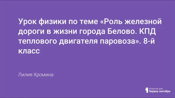 Урок проводится в 8-м классе при изучении раздела «Тепловые явления». Данный урок – работа, которая посвящена поиску эффективных нетрадиционных форм организации урока. Урок посвящён 80-летию города Белово. На уроке рассматривается роль железной дороги в истории становления г. Белово, разбирается строение, принцип работы и физические характеристики самых первых и современных паровозов. Обучающиеся учатся решать задачи интегрированного содержания с использованием данных с табличек у памятников Паровозу на привокзальной площади г. Белово и железной дороги.