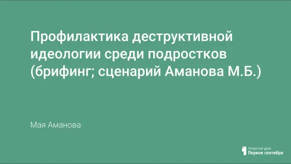 Внеклассное мероприятие можно провести в рамках школьного дискуссионного клуба среди старших школьников. Урок-брифинг посвящен профилактике деструктивного поведения среди подростков, противодействию деструктивной (криминальной) идеологии. Целью мероприятия является: разъяснение правовых последствий криминальных деяний; разъяснение общих норм морали и поведения в соответствии с российским законодательством; налаживание доверительного контакта между учащимися и педагогами; профилактика деструктивного поведения среди подростков.