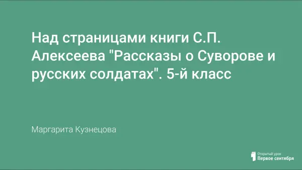 Цель статьи: представление материалов урока внеклассного чтения по книге С.П. Алексеева "Рассказы о Суворове и русских солдатах", который логически продолжает тему защиты Отечества, звучащую в таких произведениях, как "Бородино" М.Ю. Лермонтова" и в фрагменте из романа Л.Н. Толстого "Война и мир" "Петя Ростов".