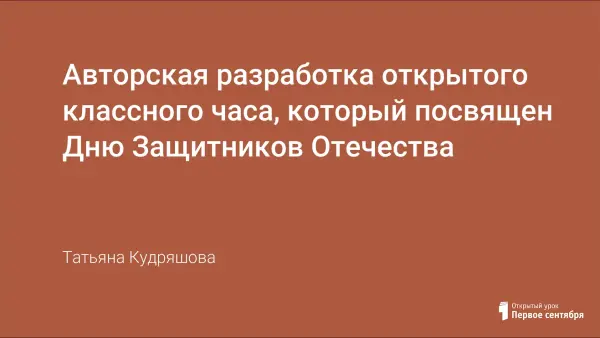 День Защитника Отечества каждый год отмечает вся страна. Предлагаю авторскую разработку открытого классного часа, который посвящён этому важному празднику. Цели классного часа - познакомить учащихся с историей возникновения данного праздника, вспомнить славные подвиги земляков, воспитывать чувство гордости за свой народ, любовь к Родине.