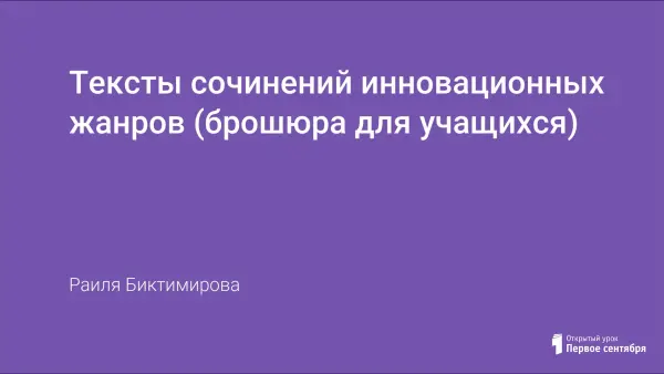 В материале представлены тексты сочинений инновационных жанров: рецензия, интерпретация поэтического текста, анализ эпизода, а также тексты других жанров: эссе, литературно-критическая статья, созданные учащимися школы №5 г. Кумертау Республики Башкортостан.