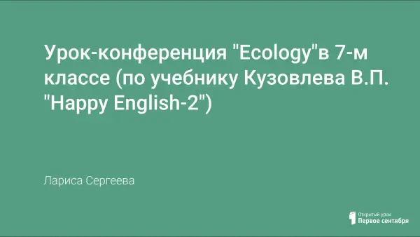 Данный урок является заключительным по теме "Экология" в 7-м классе. Урок построен как конференция, на которой учащиеся обсуждают проблемы по охране окружающей среды, выдвигают пути их решения.