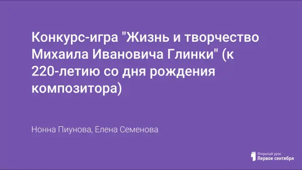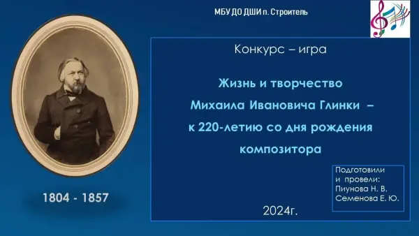 Данная работа представляет собой описание внеклассного мероприятия в Детской школе искусств. Оно было проведено для учащихся выпускных классов ДШИ в виде соревнования команд, подготовленных двумя преподавателями теоретических дисциплин. Мероприятие предполагает участие учащихся старших классов ДШИ. Такое мероприятие является одной из возможных форм обобщающего занятия по жизненному и творческому пути композитора Михаила Ивановича Глинки в курсе предмета «Музыкальная литература».