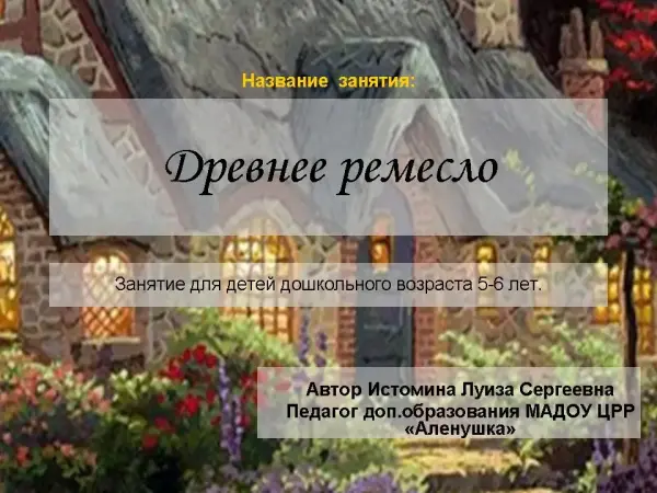На занятии старшие дошкольники одновременно знакомят с древним видом искусством ‒ гончарным, особенностями добычи глины, изобретением человечества ‒ гончарным кругом. В ходе практической работы дети закрепляют понятие объемной формы, строение и пропорции предметов, учатся декоративному заполнению пространства.
