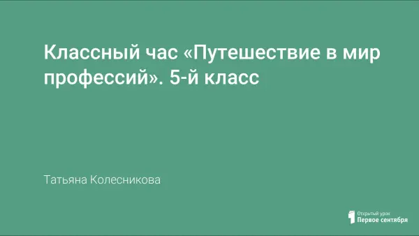 Классный час «Путешествие в мир профессий», один из нескольких по профориентации, содержит сведения о многообразии профессий. Предназначен для учащихся 5-го класса. Проводился с приглашением школьного психолога и библиотекаря. Готовит детей к осознанному выбору будущей профессии. Необходима предварительная подготовка для его проведения. Дать задание познакомиться с профессией своих родителей, написать эссе.