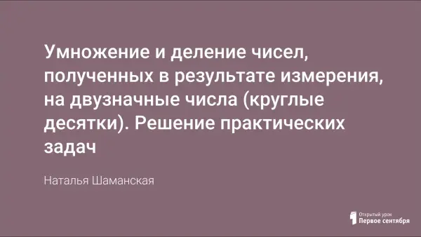 Цели урока: закреплять и совершенствовать знания учащихся о числах, полученных при измерении и их соотношениях; закреплять и совершенствовать знания и умения учащихся преобразовывать данные числа в более крупных, более мелких мерах; формировать умения и навыки письменного умножения и деления чисел, полученных при измерении, на круглые десятки; формировать умения составлять, преобразовывать, решать практические задачи.