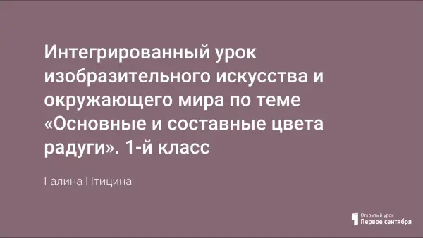 В ходе урока у детей формируется понятие об основных (красный, жёлтый, синий) и составных (оранжевый, зелёный, фиолетовый, оттенки) цветах. В ходе экспериментальной практической работы ученики самостоятельно получают составные цвета и используют из для выполнения рисунка. Данный урок можно провести как интегрированный с уроком «Окружающий мир», т.к. он содержит материал по теме «Явления природы».