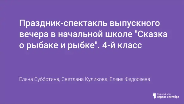 Праздник-спектакль выпускного вечера в начальной школе «Сказка о рыбаке и рыбке» проводится для родителей и учащихся начальных классов. На данном празднике учащиеся выпускного класса показывают свои достижения в различных видах искусства: музыкальном, вокальном, хореографическом, фольклорном, художественном, театральном, литературном.