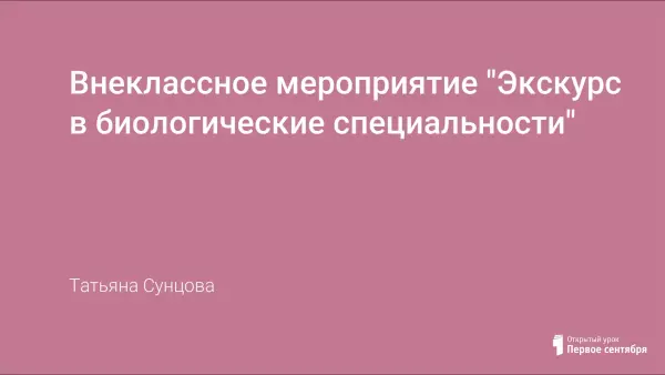 Данное внеклассное мероприятие адресовано обучающимся 8–11-х классов общеобразовательных организаций. На параллели 8–11-х классов проводится предпрофильная и профильная подготовка учащихся. Во время проведения предметной недели «Биологии – химии» предлагается познакомиться с биологическими специальностями. Биология – сложная и интересная наука, моя задача, как учителя, – показать разнообразные направления биологических специальностей, оказать помощь подростку в выборе будущей профессии.