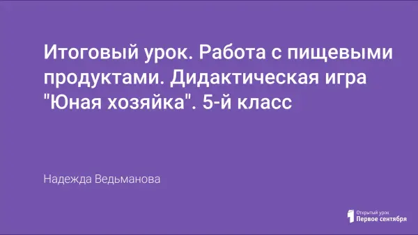 В статье описан итоговый обобщающий урок по теме «Кулинария. Работа с пищевыми продуктами». Занятие проходит в качестве дидактической игры «Юная хозяйка». Для подготовки к игре, учащиеся повторяют весь курс занятий по теме «Кулинария». Командная игра развивает чувство ответственности, взаимовыручки, товарищества.