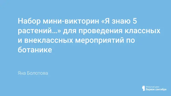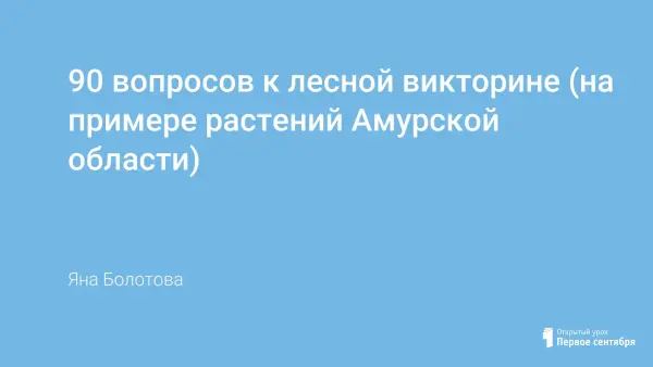 Викторина по древесным растениям состоит из 90 вопросов о более 40 растениях Амурской области. Интересные факты о жизни и истории растений способны выступить в роли получения новых знаний, их закрепления и углубления. Вопросы могут быть использованы в виде этапа или раунда в более крупном мероприятии, например, ботанического КВНа при проведении недели биологии в школе или служить дополнительными вопросами в ранее опубликованной игре "Биржа ботанических знаний".