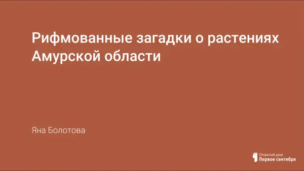 Любимое занятие многих детей – загадывание и отгадывание загадок. Детские загадки имеют важную педагогическую функцию, формируя у детей навыки логического мышления, развивая их наблюдательность, память, смекалку, воображение. Есть загадки, ответ которых произносится хором всеми присутствующими. В виде рифмованных загадок описаны особенности 32 растений флоры Амурской области. Они написаны стихами, слово, являющееся ответом на загадку, является последим в стихотворной строке.